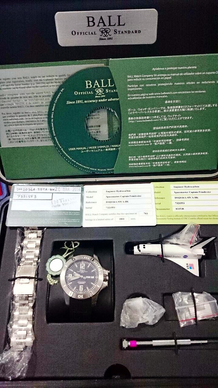Perlengkapan di dalam kopor terdiri dari: Jam, bracelet original, miniatur pesawat ulang alik NASA yang dikomandanni oleh Astronaut Captain Pointdexter, screw diver, CD petunjuk penggunaan jam, tags penjualan, kartu garansi tertanggal 20 Maret 2014 (katu garansi Ball Watch berlaku hingga 2 tahun sejak tanggal pembelian jam)..kartu sertifikat telah lulus uji C.O.S.C, dan kartu sertifikat limited edition dimana jam ini adalah jam produksi ke 703 dari total produksi yang hanya 1000 unit.